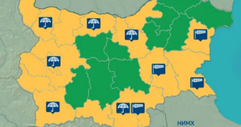 За утре - вторник, 18 ноември, е обявен жълт код за сериозни валежи в 13 области от страната - Видин, Монтана, Враца, Плевен, Велико Търново, Русе, София област, София-град, Перник, Кюстендил, Благоевград, Смолян и Кърджали, предупреждават от НИМХ.