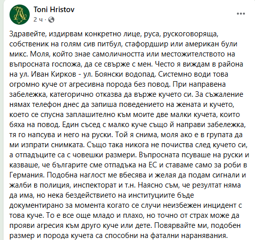 Сигналът идва от Тони Христов, който публикува подробно описание на случилото се и призив за съдействие. Той издирва жена – руса, рускоговоряща, придружавана от едро сиво куче, определено като питбул, стафордшир или микс с американ були. По думите му въпросната жена редовно разхожда животното без повод в района на улиците „Иван Кирков“ и „Боянски водопад“, въпреки направени многократни забележки.