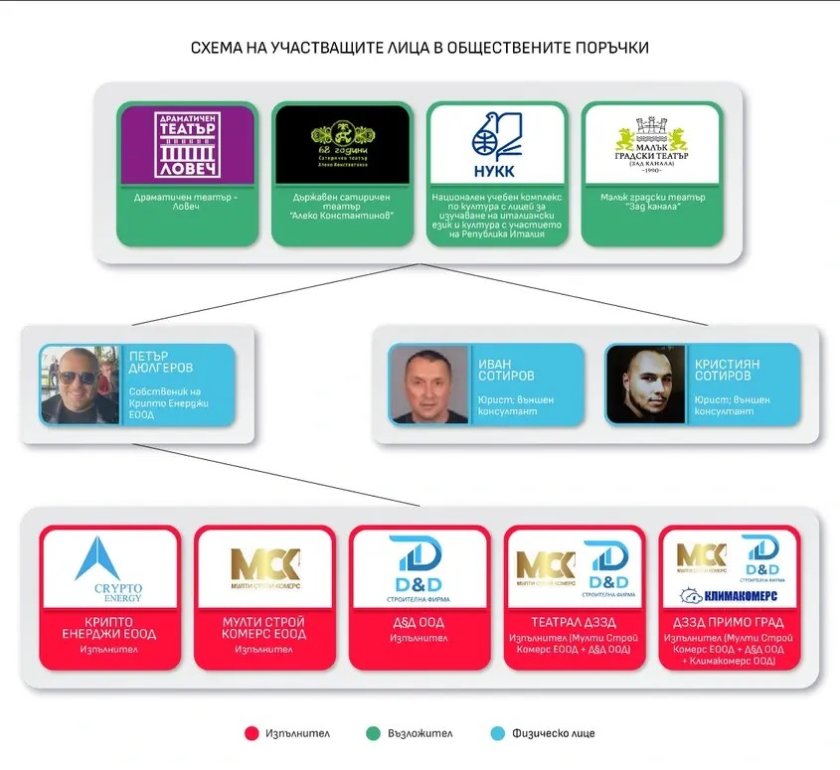Едновременно с това адв. Иван Сотиров заявява регистрацията на “Театрал” ДЗЗД, а синът му е член на комисията, която избира същото дружество за изпълнител на поръчката.