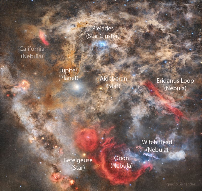 На това изображение е истински миш-маш от космически обекти. Тук са звездният куп Плеяди, мъглявините Примката на Барнард и Орион, звездите Алдебаран и Бетелгейзе, мъглявините Главата на вещицата, Примката на Еридан и Калифорния. Всичко е снимано в продължение на16 часа в тъмното небе над Гранада, Испания, а после събрано в едно изображение. Идеята е да се покаже колко е трудна професията на астрономите.
