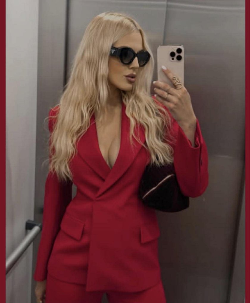С леко провокативен жест Натали Трифонова отново успя да привлече вниманието към себе си. Тя се показа облечена в червен костюм, небрежно разкопчан точно толкова, колкото да предизвика въображението.