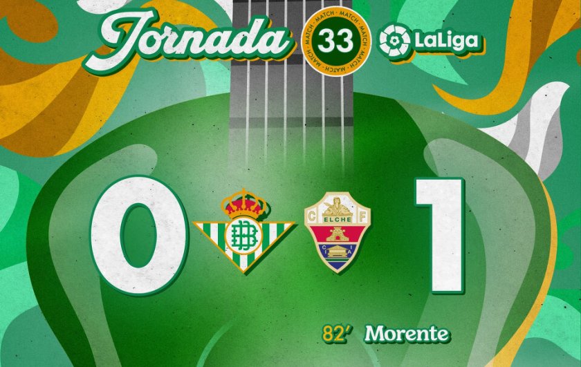 Бетис допусна поредна грешка в борбата за топ 4 и като че ли догодина няма да участва в групите на Шампионска лига. „Вердибланкос“ отстъпиха с 0:1 на Елче в мач от 33-ия кръг на Ла Лига.