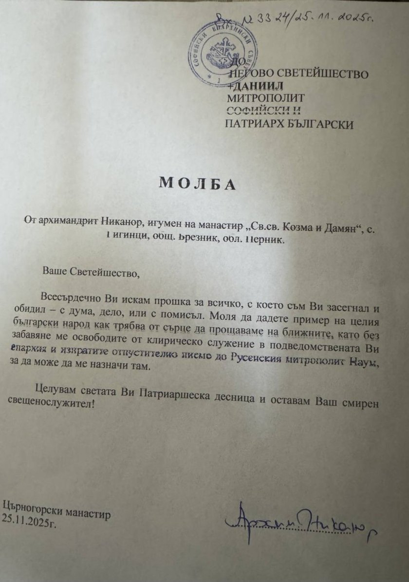 За целта Никанор е внесъл молба в деловодството на Софийска митрополия.