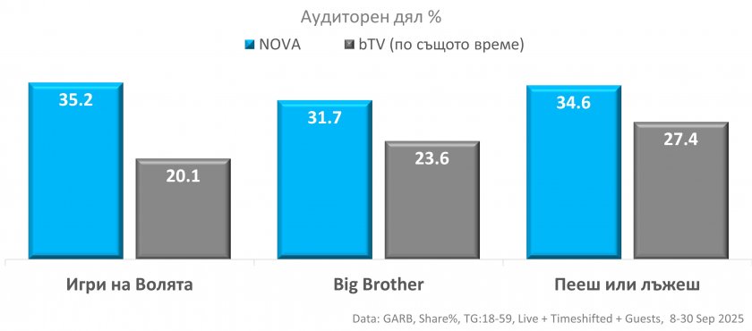 Според официалните пийпълметрични данни, и трите развлекателни предавания от есенната програмна схема са привлекли най-висок среден аудиторен дял сред телевизионните зрители на възраст 18-59 години. Втората телевизия в класацията остава далеч назад по същото време.