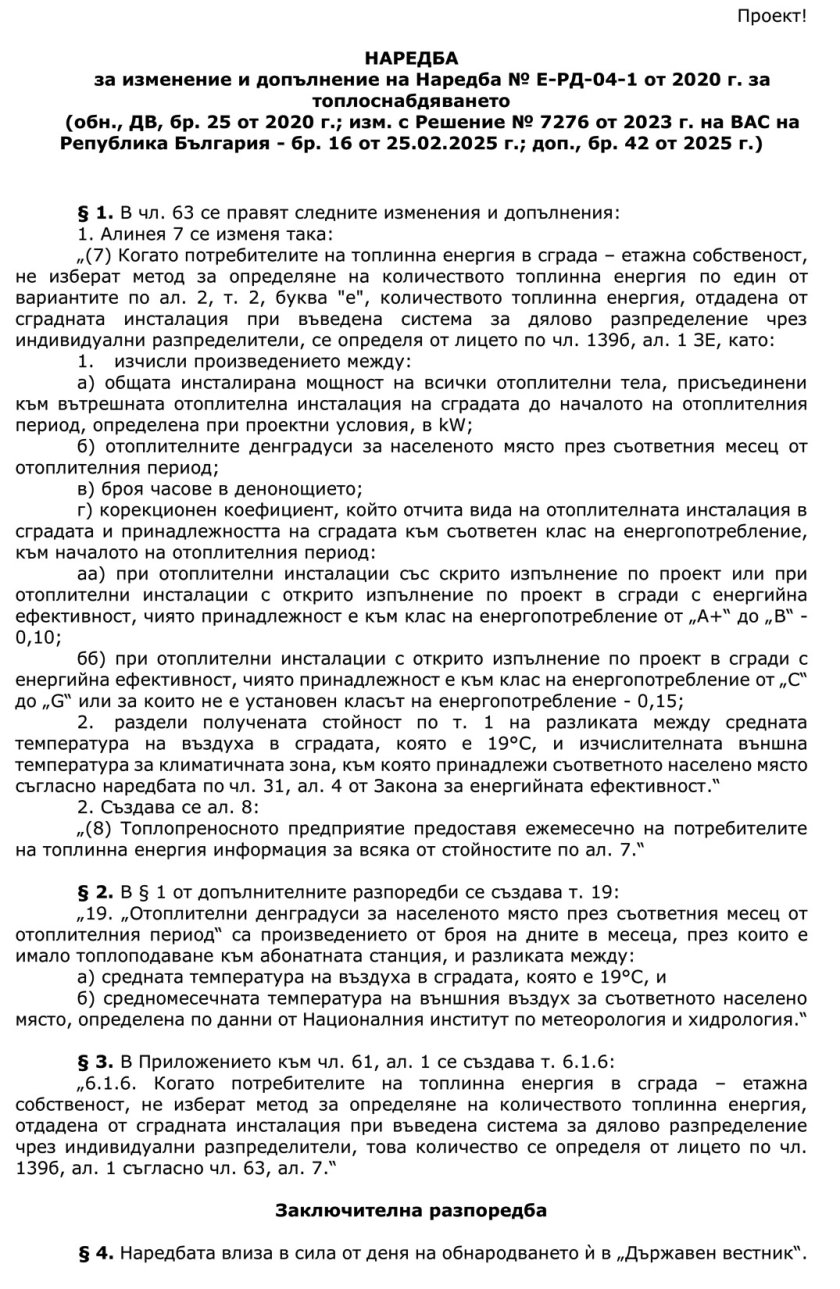 Топлофикационното дружество трябва всеки месец да дава на потребителите всички стойности, използвани в изчислението (мощност, денградуси, коефициент и т. н.), пише още в наредбата, която може да намерите на: https://www.me.government.bg/uploads/manager/source/VOP/obshtestveno%20obsajdane/13032026/Proekt_NT_Final.pdf