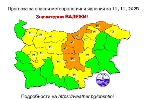 Днес е обявен оранжев и жълт код за значителни валежи. Предупреждението е в сила за 17 области в страната. В областите Силистра, Русе, Стара Загора, Габрово и Пловдив е обявен предупредителен оранжев код за опасно време.