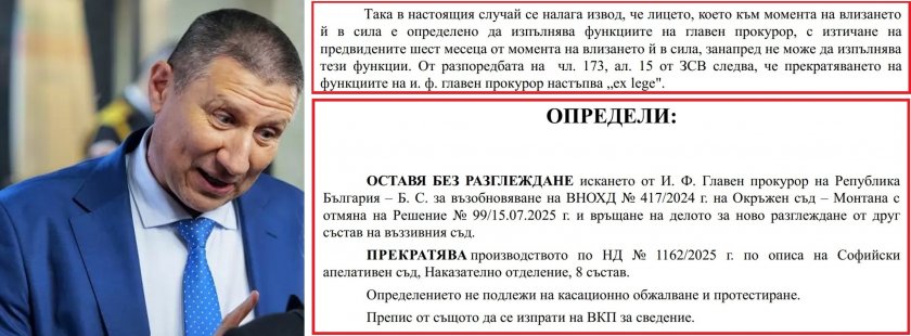 Това съобщават от Bird.bg на своята фейсбук страница. Ето какво още поясняват от сайта: "САС също така приема, „че лицето, което към момента на влизането й в сила е определено да изпълнява функциите на главен прокурор, с изтичане на предвидените шест месеца от момента на влизането й в сила, занапред не може да изпълнява тези функции“. Поради което съставът оставя без разглеждане искането на Сарафов за възобновяване на ВНОХД по описа на Окръжен съд Монтана.
