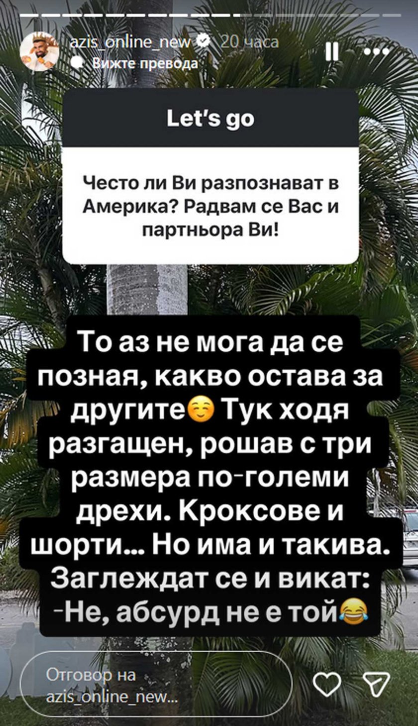Азис признава още, че сам не може да се познае, отговаряйки дали ги разпознават по улиците. А на друг въпрос отговаря, че ще се връща в България, няма да се установи за постоянно зад океана.