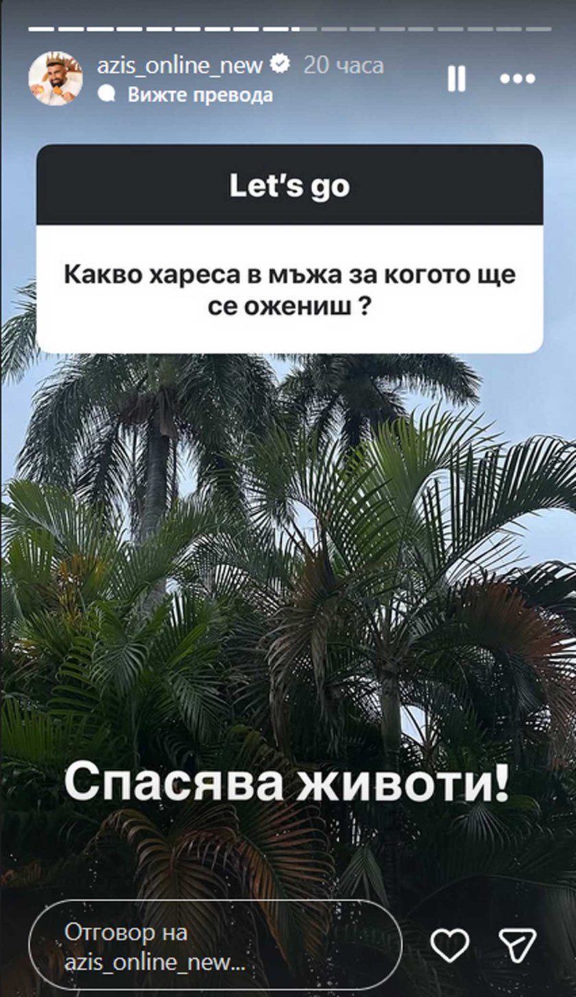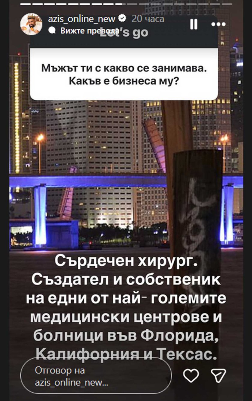 Преди дни Азис хвърли бомбата, че ще се омъжва, а вече разкри, че съпругът му е по-възрастен и работи като сърдечен хирург. "Създател и собственик на едни от най-големите медицински центрове и болници във Флорида, Калифорния и Тексас", уточни фолкпевецът.