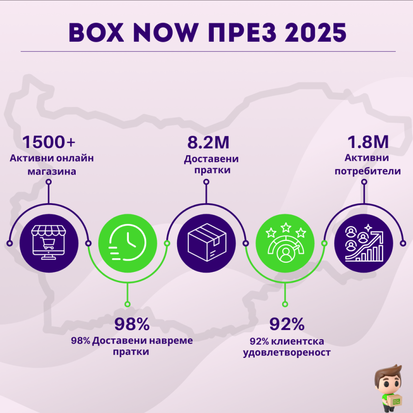 Според данните на BOX NOW 98% от пратките им са доставени в срок през 2025 г., което допринася за по-голяма предвидимост и по-малко провалени доставки – фактор, който е от значение както за крайните получатели, така и за онлайн търговците.