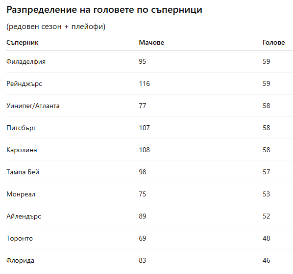 След това попадение разликата между двамата в общата класация е едва 16 гола – дистанция, която капитанът на Вашингтон би могъл да навакса дори в рамките на половин сезон, ако продължи кариерата си в НХЛ.
