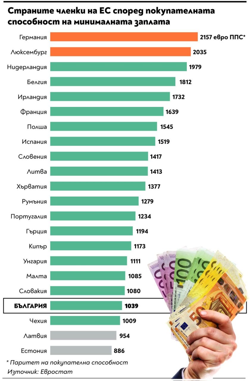 В същото време България, Унгария, Литва и Словакия са с най-големи скокове на минималната заплата по покупателна способност - с над 11 на сто. У нас фактор за това е автоматичният механизъм зa вдигaнe нa минимaлнaтa зaплaтa cпopeд движeниeтo нa cpeднaтa. Това е политика, силно критикувана от бизнеса, която обаче съществува в още десетина държави от Евросъюза.
