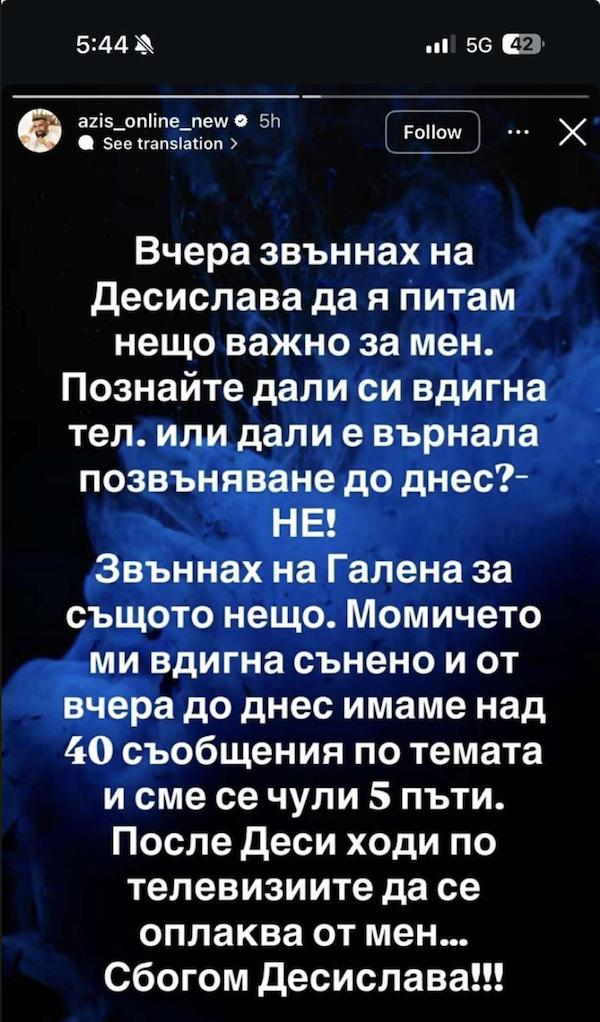 Това не е първият път, в който Азис обвинява Десислава, че не си вдига телефона и не му отговаря, но досега до крайности, че с приятелството им е свършено, не се е стигало.