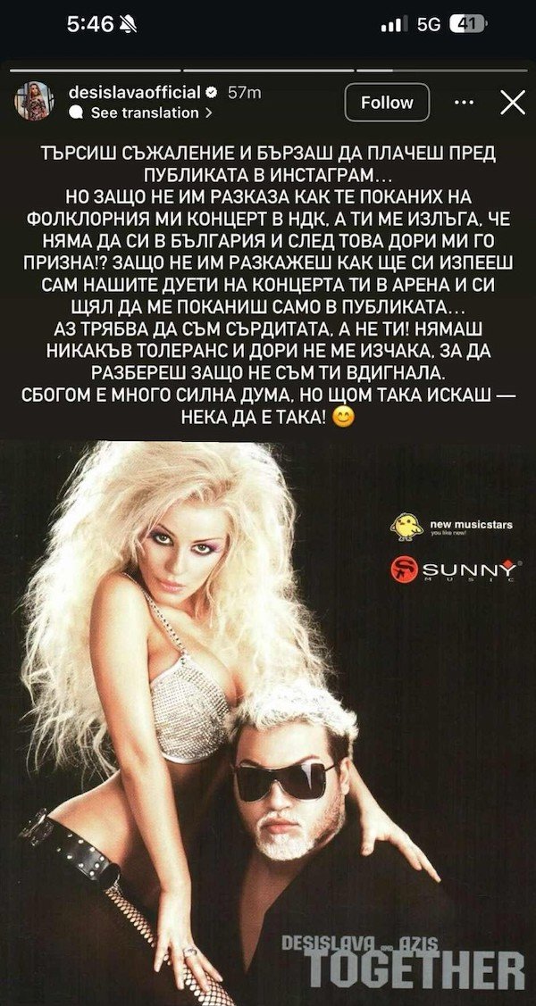 Нов скандал се разрази в средите на попфолка между две от големите звезди в бранша и дългогодишни приятели - Азис и Десислава.