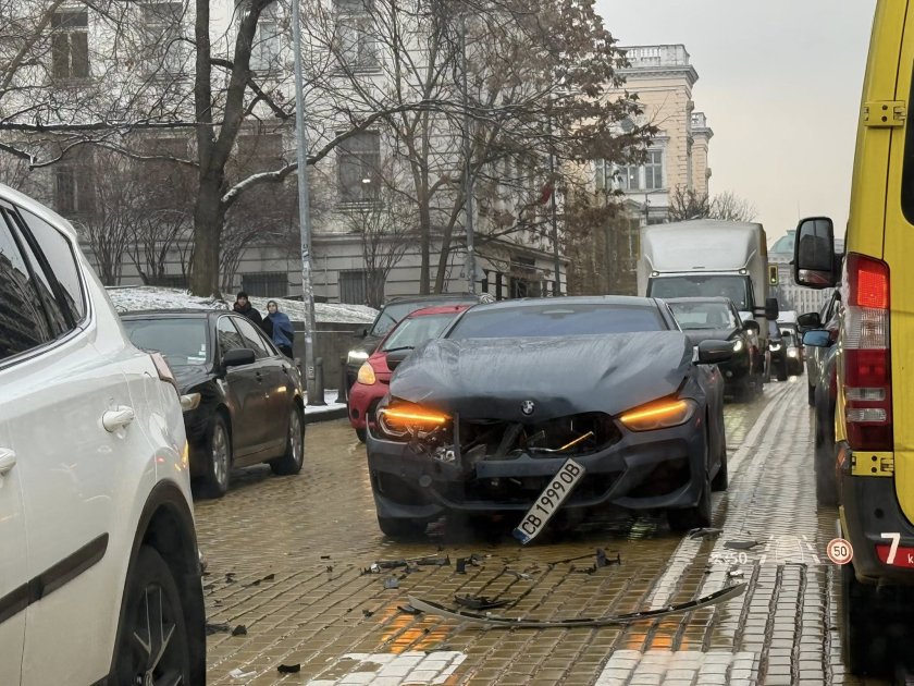 Лъскаво БМВ се потроши на жълтите павета в центъра на София. Точно на една от пешеходните пътеки баровската кола са хлъзна и се натресе в белия SUV "Тойота" пред нея, се вижда от публикация в социалните мрежи.