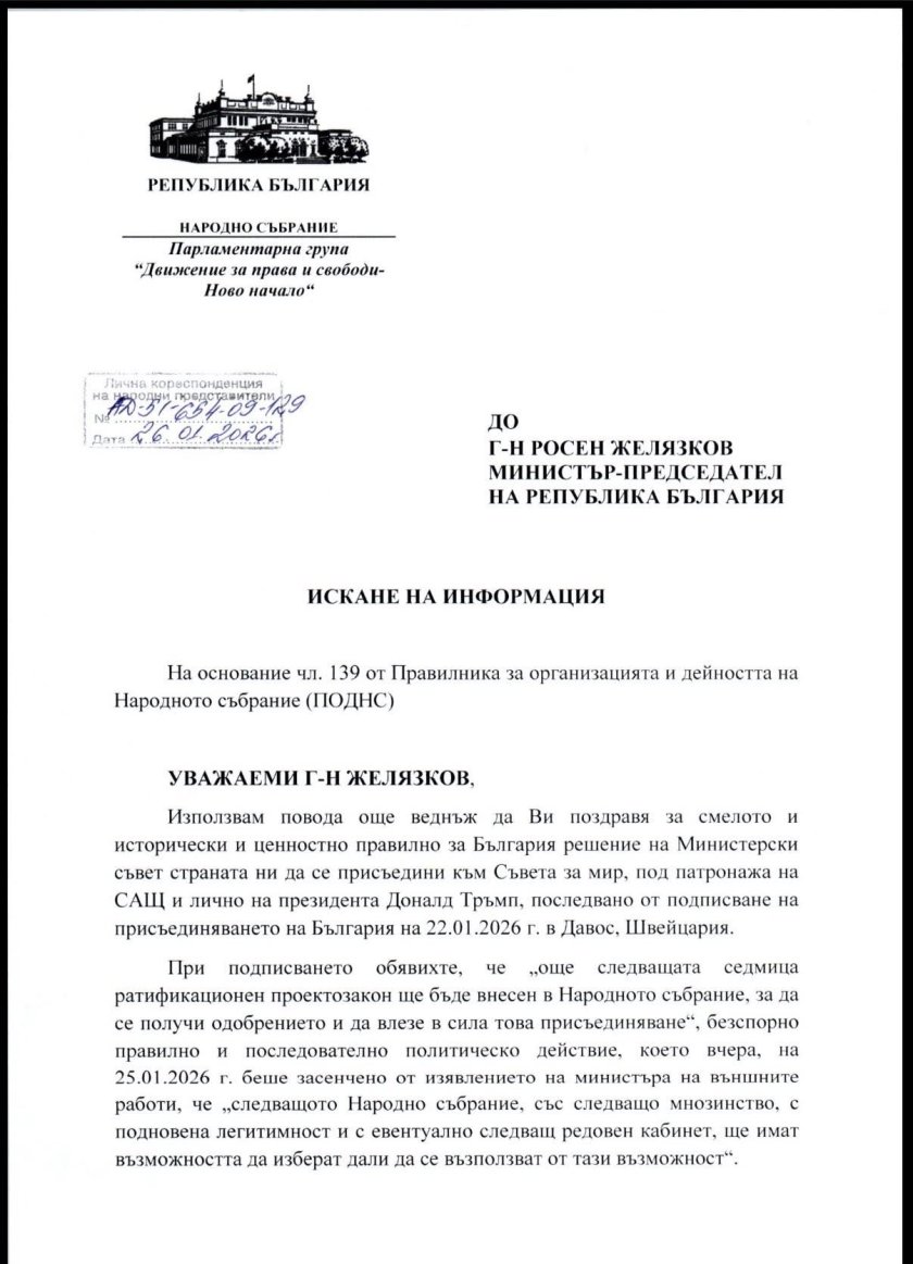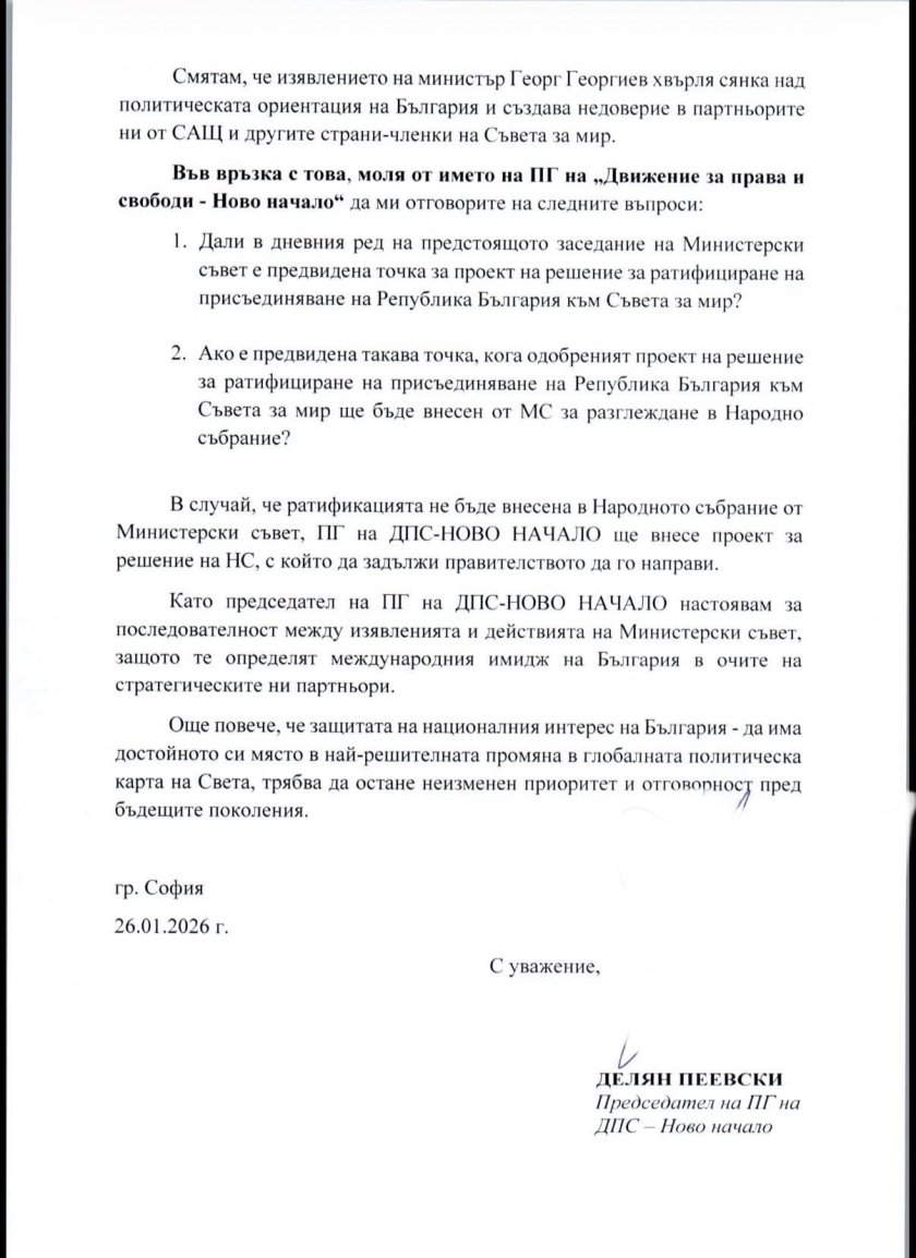 Лидерът на ДПС-НН Делян Пеевски поиска скоростен отговор на въпроса за ратификацията на участието на България в т.нар. Съвет за мир на американския президент Доналд Тръмп след включването й на първия ред чрез премиера в оставка Росен Желязков. За целта Пеевски ребром постави въпроса на Желязков - дали темата ще бъде вкарана в дневния ред на заседанието на МС тази седмица.