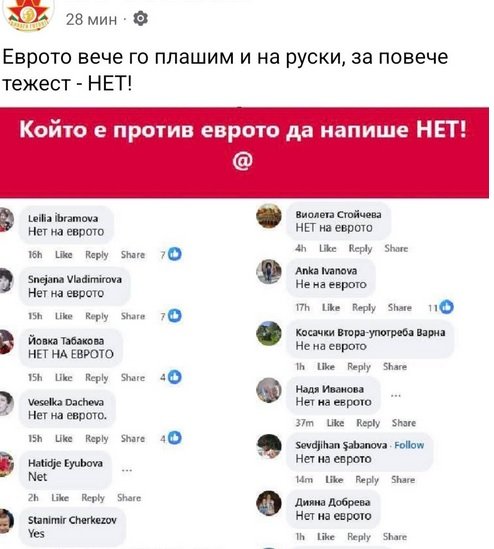 Хумористичният фейсбук профил НРБ реши уж шеговито да пусне в социалната мрежа социологическо "проучване", в което всеки, несъгласен с приемането на еврото в България, да гласува с "нет" - "не" на руски.