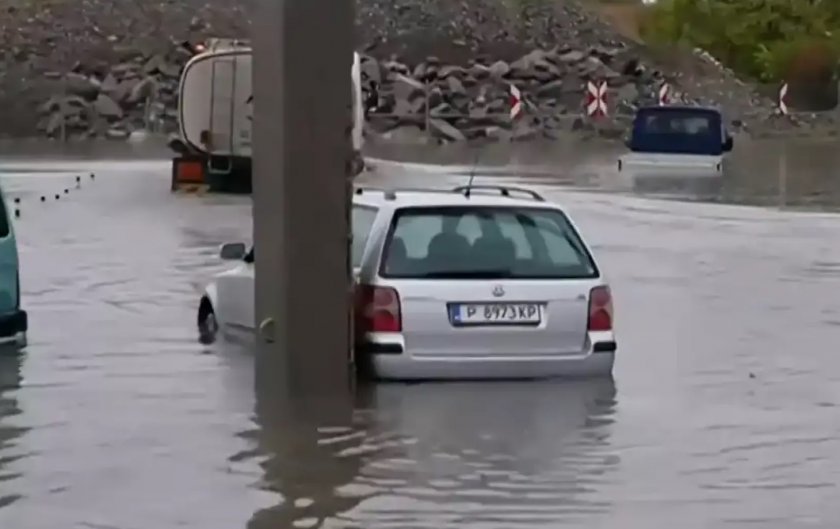 Комбинацията от интензивните валежи и непочистени отводнителни шахти превърна пътните платна в реки, което значително затрудни трафика в сутрешния час пик.