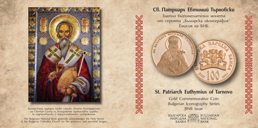 Българската народна банка (БНБ) пуска в обращение от днес златна възпоменателна монета „Св. Патриарх Евтимий Търновски“ от серията „Българска иконография“, съобщават от централната банка.