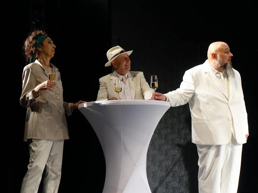 Несъмнено за сценичното действие от значение са и костюмите. А когато на финала на спектакъла героите, облечени в бели костюми и надянали черни очила, сякаш ни показват нагледно моралния сблъсък в обществото между доброто и злото. И уви невинаги доброто побеждава...