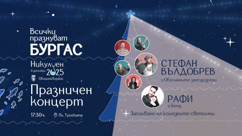 Кулминацията на празника ще бъде на площад „Тройката“, където от 17,30 часа ще се проведе големият Никулденски концерт и ще бъдат включени светлините на коледната елха. На сцената ще излязат Рафи Бохосян заедно с бенд, както и Стефан Вълдобрев и „Обичайните заподозрени“, поставяйки началото на коледните празници в Бургас.