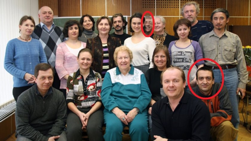 Ивайло Калушев (на преден план) и баща му Георги Калушев (на последния ред) - и двамата очертани с червен кръг, позират заедно с Долорес Кенън