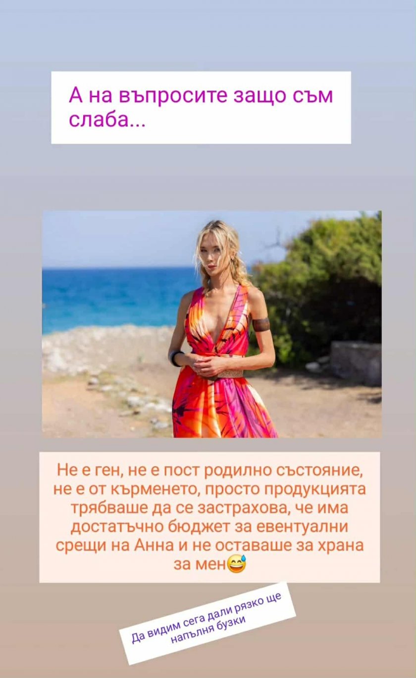 Истината според нея е далеч по-забавна – по време на снимките на „Ергенът: Любов в рая“, целият бюджет бил съсредоточен върху срещите на Анна-Шермин, и просто „не останали пари за храна“ за самата нея. С присъщото си остроумие Райна добавя, че сега остава да се види дали „рязко ще напълни бузки“. Постът й предизвика усмивки сред последователите, които оцениха самоиронията и позитивното й отношение. Караянева за пореден път показа, че може да се шегува със себе си и да приема с лекота любопитството на феновете към външния й вид.