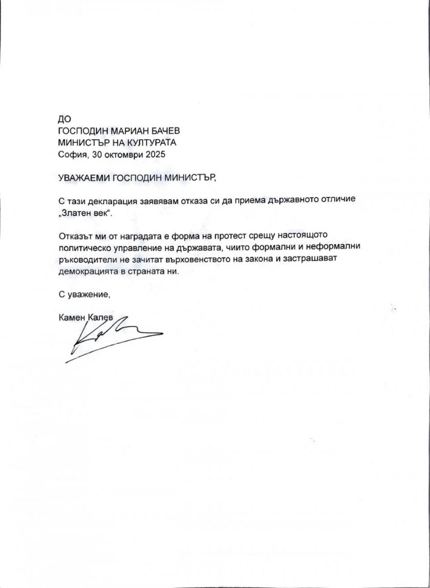 По традиция в навечерието на Деня на народните будители - 1 ноември, Министерството на културата отличи 36 творци, артисти, читалищни и научни дейци за техния принос в развитието на българската култура и духовност с награда "Златен век". Един от отличените обаче бойкотира церемонията в галерия "Средец" и веднага след края й внесе в приемната на ведомството кратка декларация, в която обяснява мотивите за отказа. Това е режисьорът Камен Калев, известен с филмите "Източни пиеси", "Островът", "С лице надолу", "Февруари".
