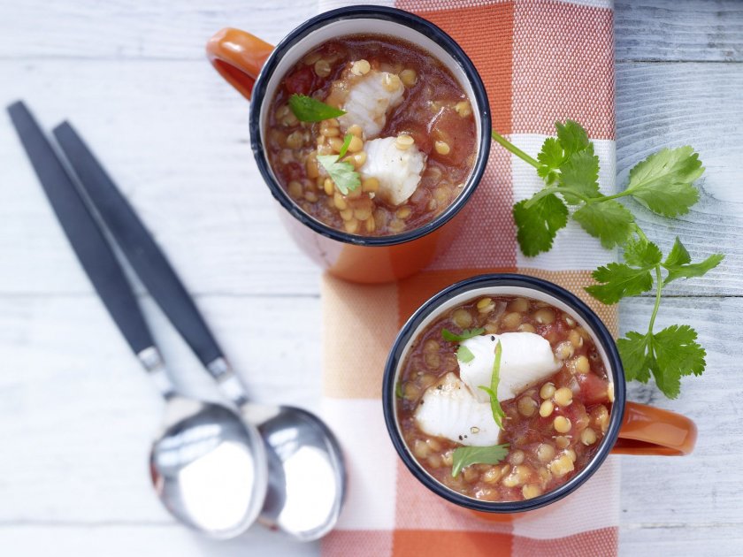 Лещата се залива с бульона и се готви 8-10 мин. на средна температура. Прибавят се доматите, кимионът и лютото чушле.