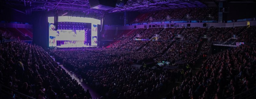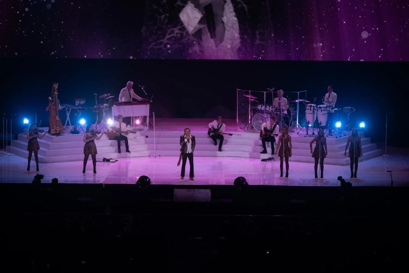 Мултимедия с огромни екрани ту връщаше зрителите в младежките години на певеца с архивни кадри от неговата звездна музикална кариера и от спортните му страсти като непрофесионален нападател и голям футболен фен, ту излъчваше концерта в залата.