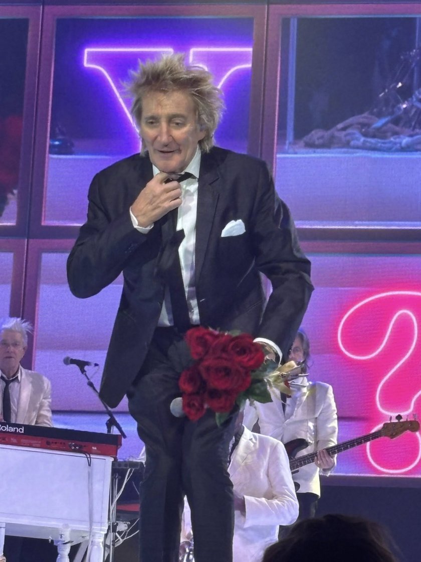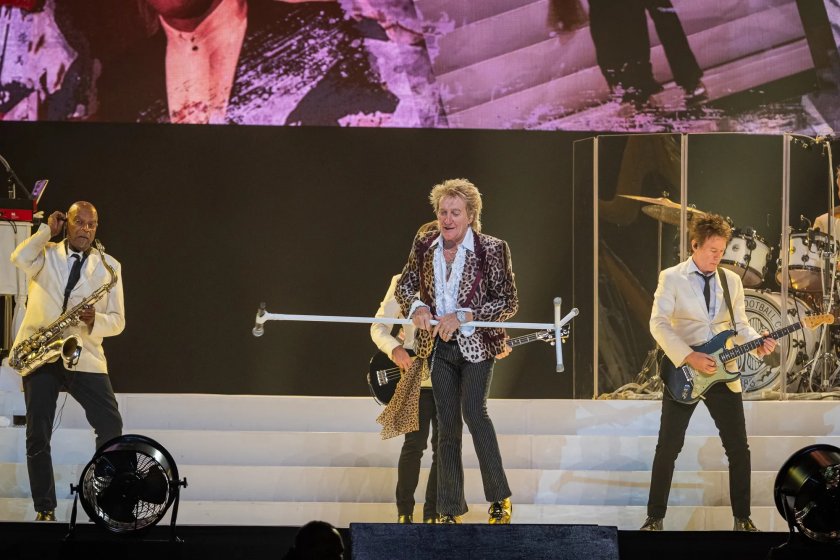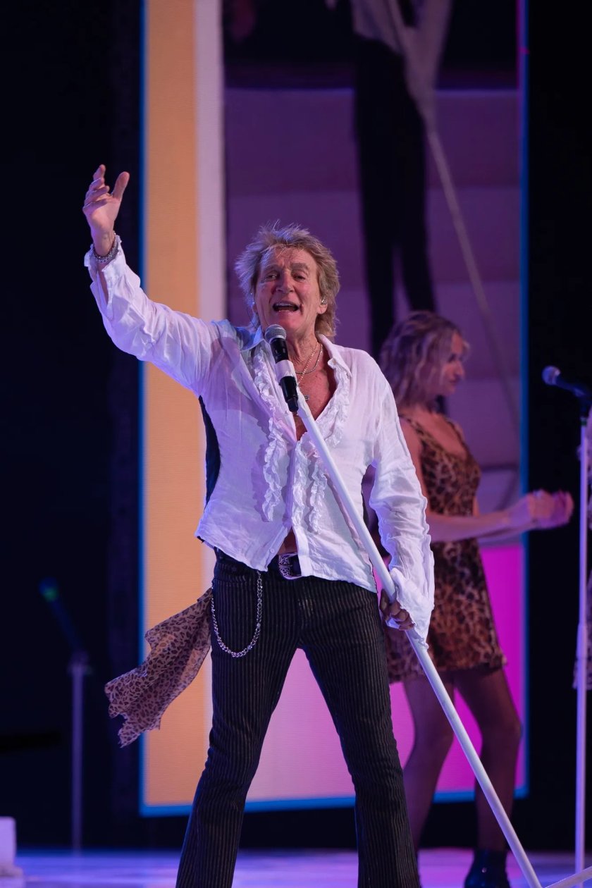 Сър Род Стюарт пя два часа на сцената, като я напускаше съвсем за кратко само за да се появи с различен костюм. Леопардов принт, сребристо сако, бляскава червена риза, черен костюм и обувки в черно, златно, сребристо или червено, с тесни дънки със звезди на задните джобове.