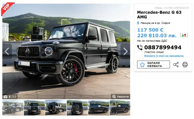 "Продавам изключително запазен и поддържан Mercedes-AMG G63 2020 г., оригинален Designo Magno черен мат. Автомобилът е в перфектно техническо и визуално състояние без дефекти, без компромиси, обслужван винаги навреме и поддържан с внимание към всеки детайл", гласи обявата на русата Златка в известен сайт за продажба на автомобили, но тя не споделя дали получава оферти за покупката му.