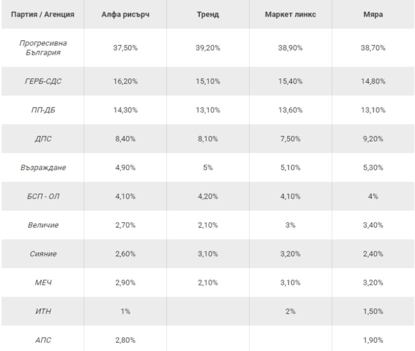 В таблицата по-долу може да видите по-подробни данни от няколко агенции, като в момента драмите са няколко. Първо, дали БСП ще прескочи 4-процентната граница, имайки предвид очакваните резултатите от чужбина, както и вотът на по-младите, които традиционно гласуват по-късно през деня.
