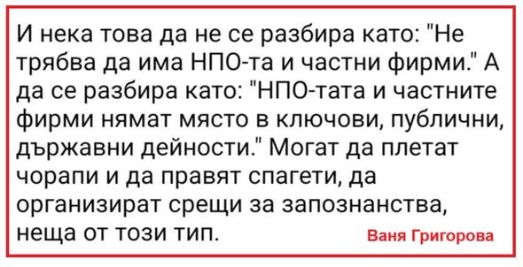 До мен достигна поредното обидно твърдение на г-жа Ваня Григорова, част от нейна публикация във Фейсбук, че всички каузи, фондации и организации с идеална цел в България, че и частните фирми, могат да правят 3 неща: