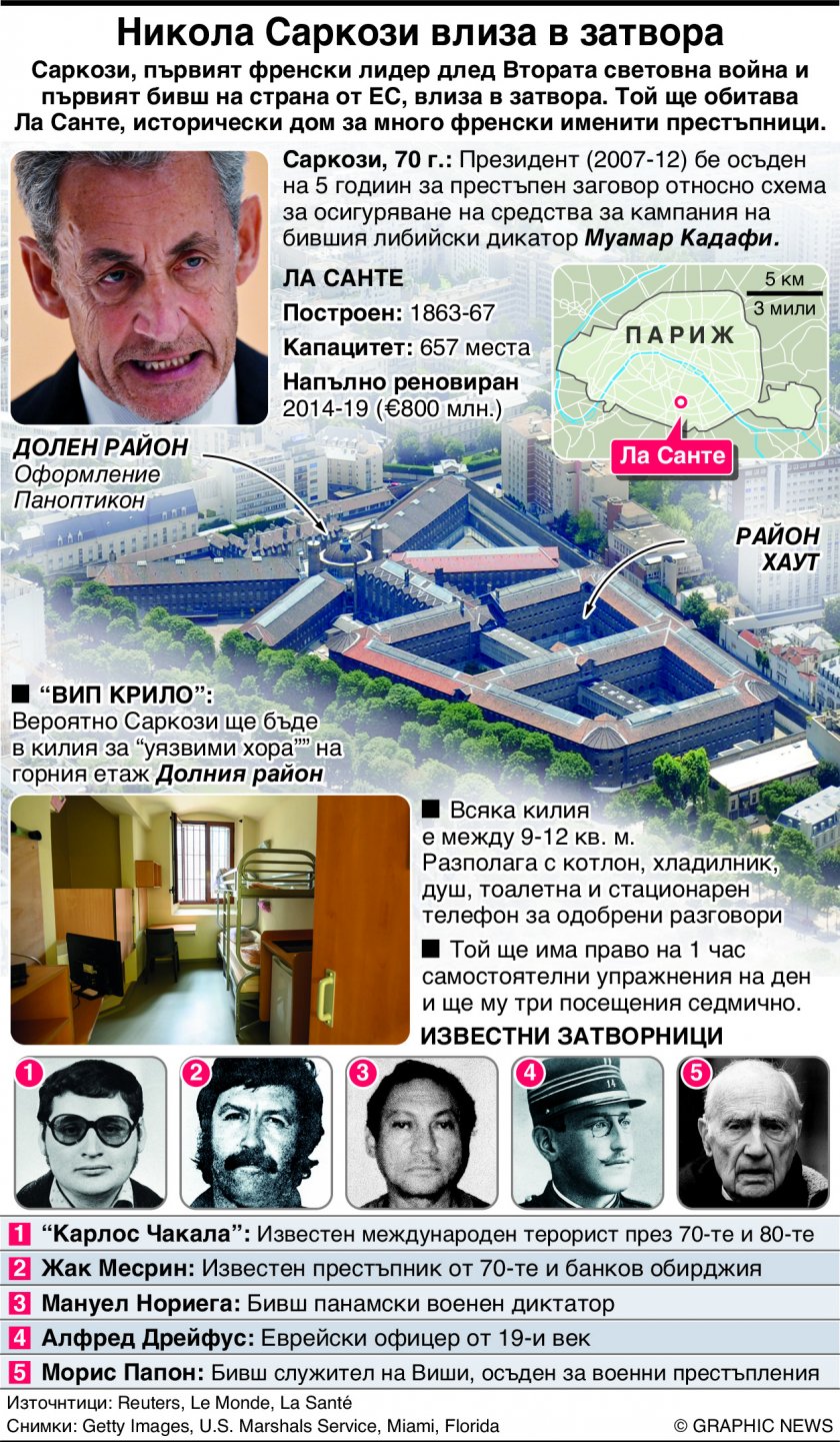 Никола Саркози, първият френски лидер след Втората световна война и първият бивш на страна от ЕС, влиза в затвора във вторник, 21 октомври. Той ще обитава "Ла Санте", исторически дом за много френски именити престъпници. 70-годишният бивш френски президент трябва да излежи 5-годишна присъда за престъпен заговор относно схема за осигуряване на средства за кампания на бившия либийски диктатор Муамар Кадафи.