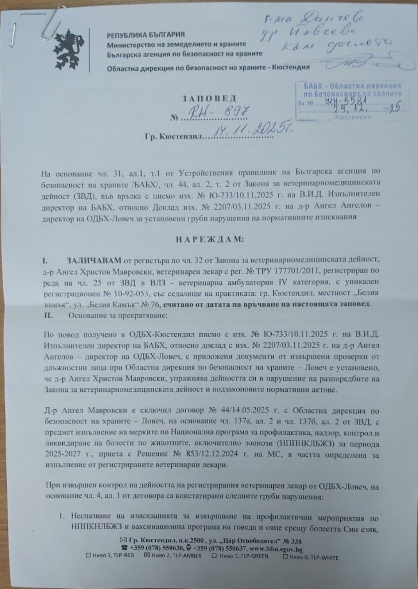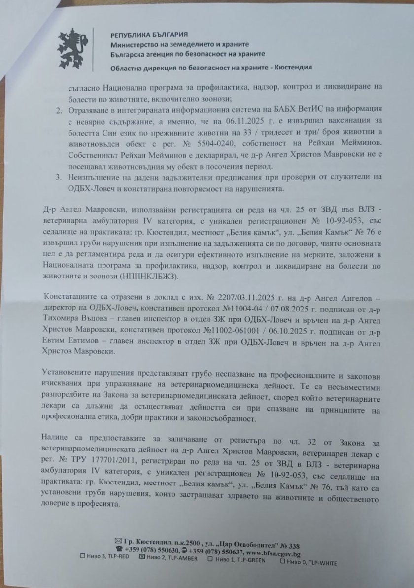 Заличаването е извършено със заповед на директора на Областната дирекция по безопасност на храните - Кюстендил от 14 ноември 2025 г., издадена на основание Закона за ветеринарномедицинската дейност след проверки на Областната дирекция по безопасност на храните - Ловеч. В заповедта се посочва, че при упражняване на дейността са установени нарушения на нормативните изисквания, сред които: