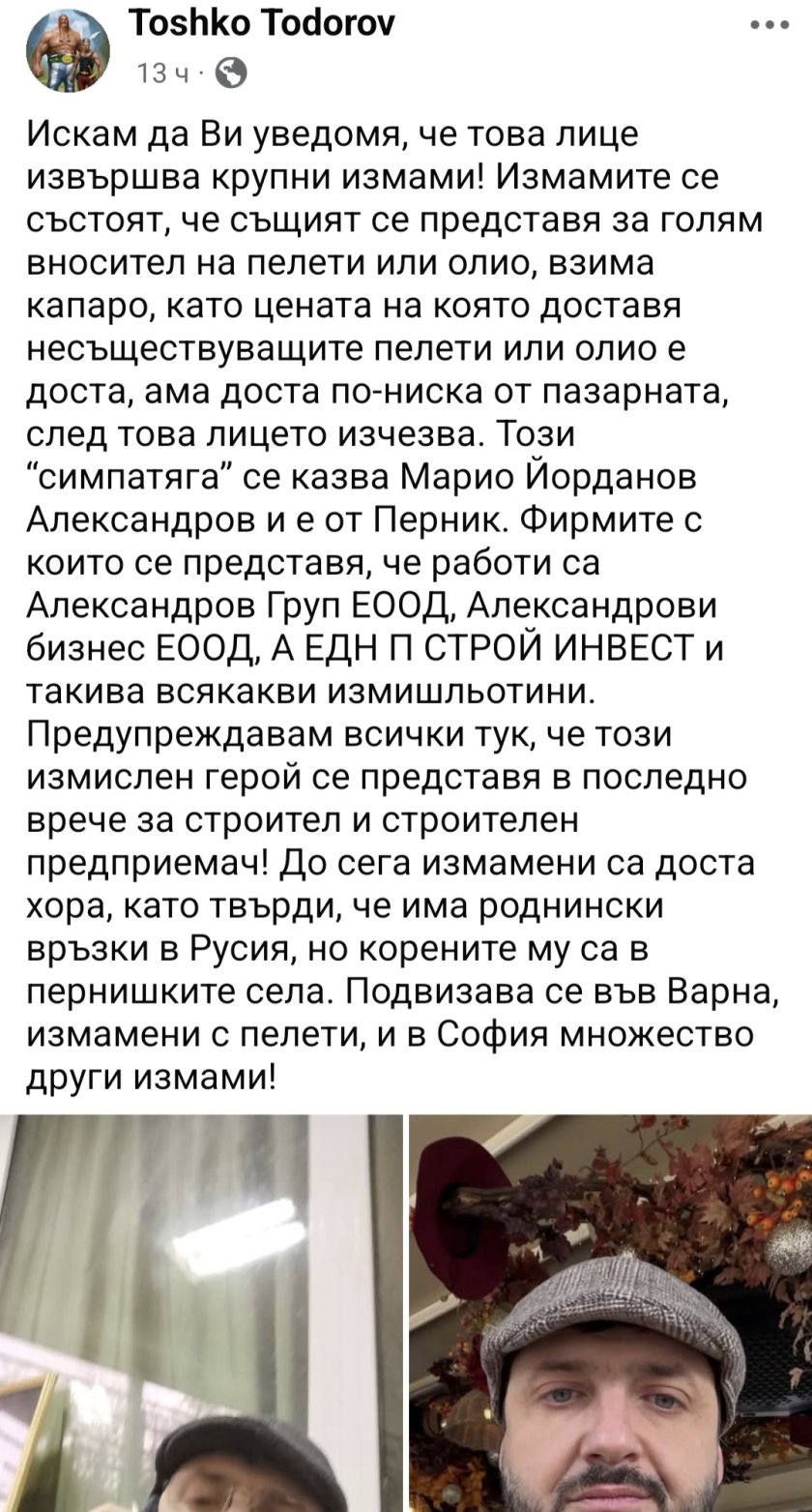 „Лицето се представя за голям вносител на пелети или олио, взима капаро, като цената на която доставя несъществуващите пелети или олио е доста по-ниска от пазарната, след това изчезва! – пише Тошко Тодоров, който застава с името си зад сигнала. Мъжът, който изгаря с немалка сума, е решен да не оставя нещата и ще си търси правата в полицията.
