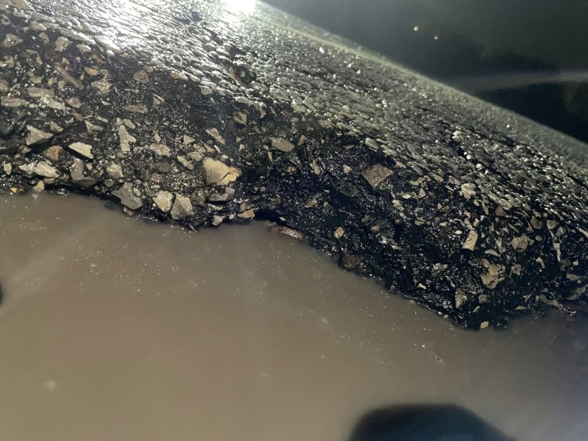 На дата 08.02.2026 г. в 1:40 ч., при движение с личния ми автомобил по Ломско шосе, след спускането на моста в посока Околовръстен път към кръговото за Костинброд, след бензиностанция Еко, попаднах в необезопасена и несигнализирана дупка на пътното платно с приблизителна дълбочина 10 см и с остър ръб.