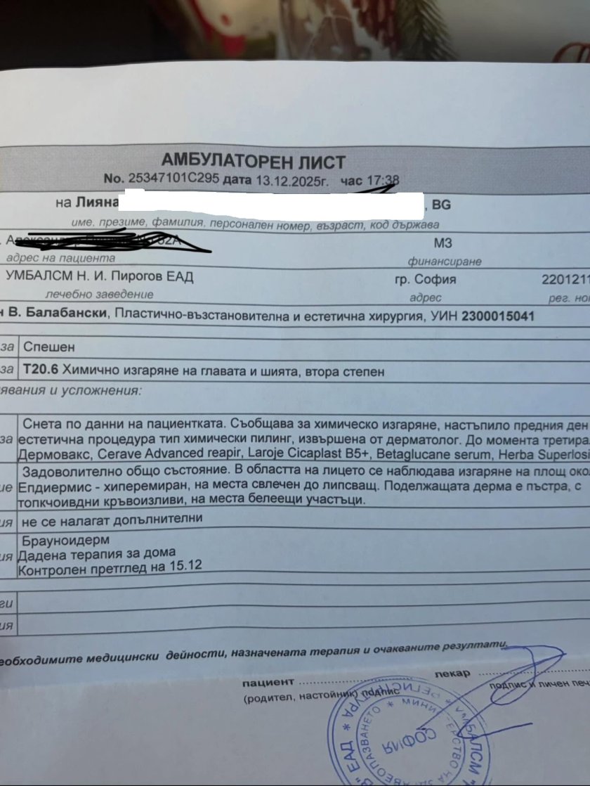 "Вечерта след пилинга болките станаха непоносими, появи се гной и мехури. Потърсих я многократно, но ситуацията беше неглижирана с думите, че „това е нормално“. Състоянието ми се влоши и отидох в "Пирогов", където беше установено изгаряне втора степен. Втори лекар потвърди същото и започнах лечение", разказа в социалните мрежи пострадалата.
