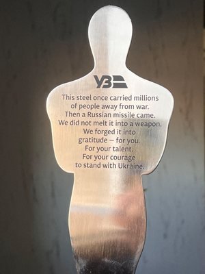 Олександър Перцовски, изпълнителен директор на украинската железопътна компания, сподели клип в социалната мрежа „Екс", в който връчва на 65-годишния актьор металната фигура, наподобяваща филмовата награда „Оскар". Материалът за статуетката е взет от влак, който е бил повреден от руската армия, казва Перцовски в клипа.