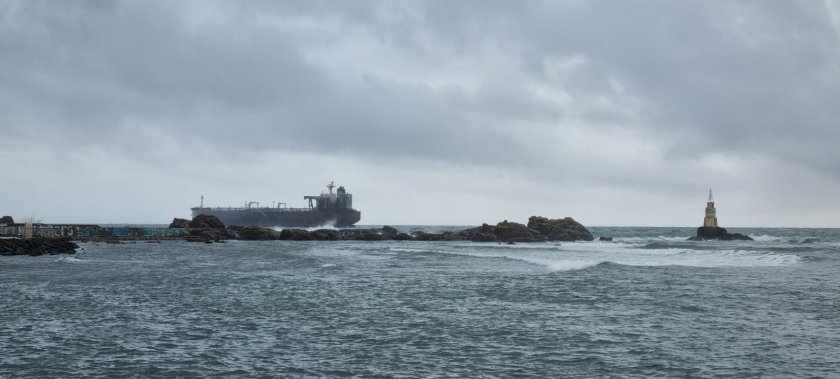 Танкерът, плаващ под чуждестранен флаг, заседна в петък край бреговете на Ахтопол. Това е един от двата кораба, поразени при украински удари с безпилотни морски дронове "Sea baby" на 28 ноември.