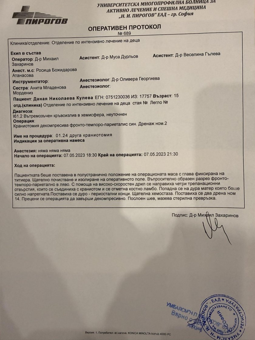 От който обаче лъсват брутални нови факти и обстоятелства за начина, по който Даная е била третирана в болницата и хвърлят яснота, че екипите в състава на детската Клиника по неврохирургия не са били на едно мнение по казуса.