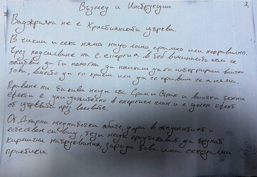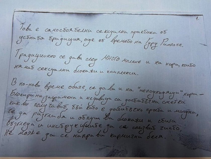 В личната обител на лама Ивайло Калушев в хижа „Петрохан“ разследващите са открили подробни тайни записки за сексуалните практики на Петроханската секта, представени като „устна традиция от времето на Гуру Ринпоче“, разкриха пред Breaking.bg високопоставени източници от МВР.