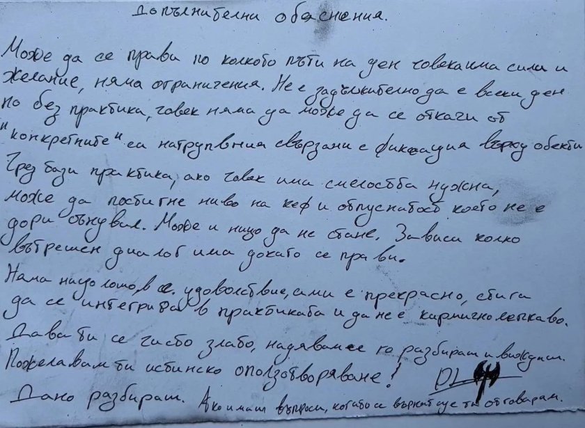• Емоционална експресивност, комбинирана с манипулативен потенциал – умереният наклон и нуждата от контакт сочат умение да печели доверие, особено сред уязвими хора. Същата ръка, която пише „без срам, без вина, с радост и кеф“, е писала и списъците с лицата и НПО-тата, свързани с ПП-ДБ.