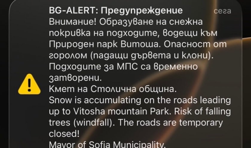Според официалното съобщение предупреждението е заради образуването на снежна покривка на подходите към Природен парк "Витоша" и опасност от падащи дървета и клони в този участък. Пътищата в района са временно затворени за моторни превозни средства.