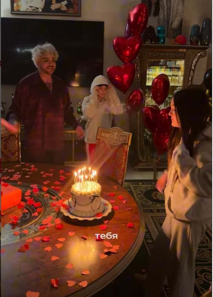 Точно в 00:00 часа бащата и братът на Алла-Виктория я повикали в затъмнената стая. В момента, в който момичето прекрачило прага, двамата изстреляли конфети, а на масата я чакала запалена празнична торта. Певецът, облечен в луксозна винена пижама „Баленсиага“, режисьорски ръководел всеки детайл. Момичето не издържало на емоцията и се разплакало от умиление още в първите секунди.