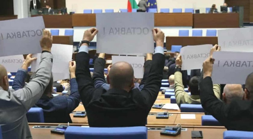 Народни представители от парламентарната група "Морал, единство, чест" (МЕЧ) вдигнаха листи с надписи "Оставка" и викаха "Оставка", след като Киселова заяви, че няма кворум и следващото заседание е утре.
