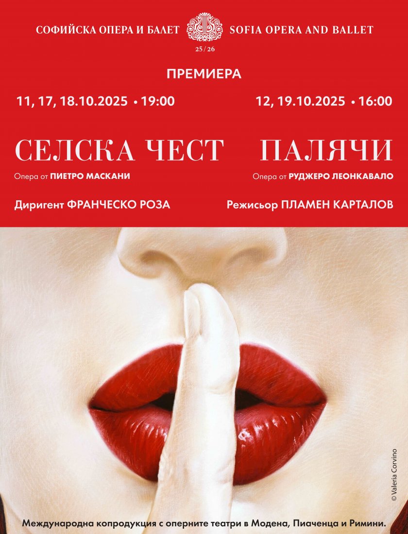 На 11 октомври Софийската опера кани своята публика на първата си оперна премиера. Ще бъдат представени „Селска чест“ от Пиетро Маскани и „Палячи“ от Руджеро Леонкавало. Диригент е Франческо Роза, режисьор Пламен Карталов, сценографията е на Джакомо Андрико, а костюмите на Нела Стоянова.