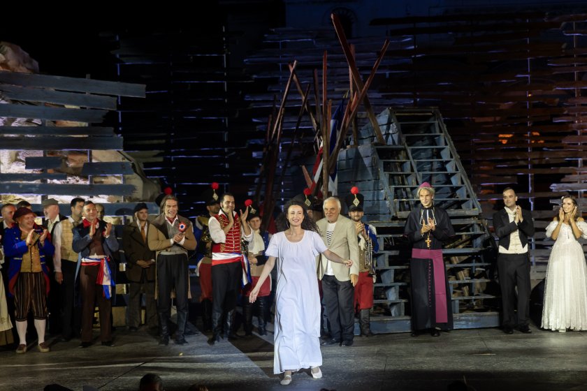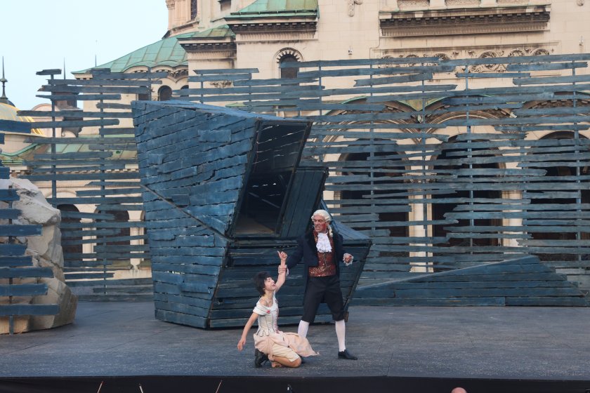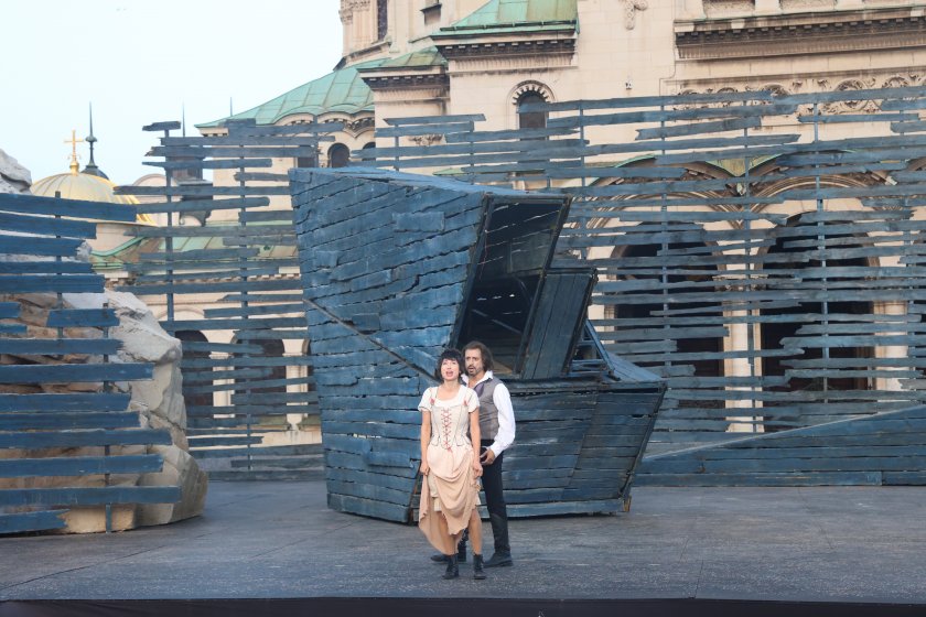 Весела Делчева в образа на Фантин и Владимир Михайлов като Жан Валжан в мюзикъла "Клетниците", който това лято за пръв път бе игран под звездното небе пред катедралата "Св. Ал. Невски"