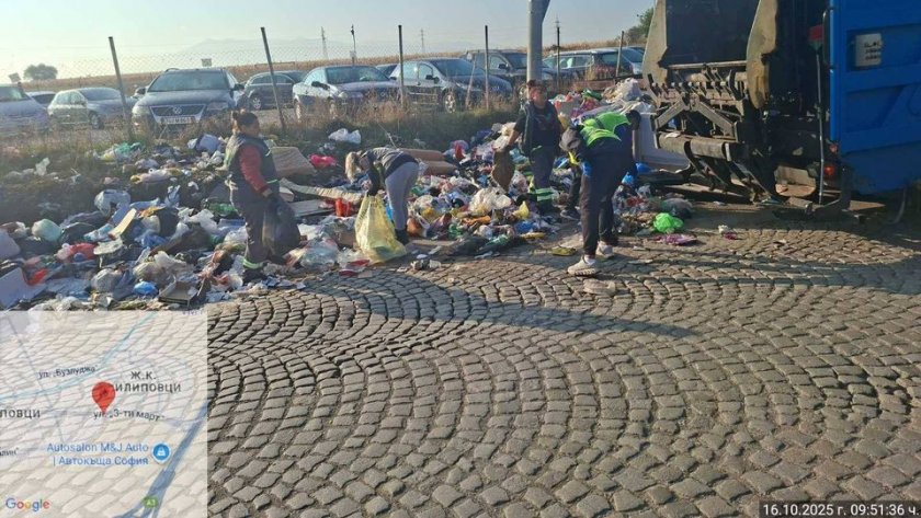 От Столичното предприятие за третиране на отпадъците: Участваха две сметоизвозващи машини, камион с хидравлична щипка и специализирана група от предприятието.